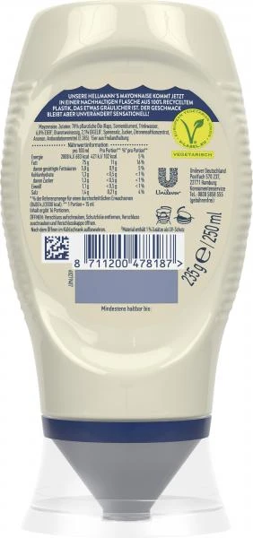 Die Hellmann’s Mayonnaise kommt jetzt in einer nachhaltigen Flasche aus 100% recyceltem Plastik, das etwas gräulicher ist. der Geschmack bleibt aber unverändert sensationell!